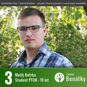 V Benátkách jsem prožil celý život, tedy 19 let. Prošel jsem si zde vzdělávacími institucemi i sportovními oddíly. Do komunální politiky vstupuji, protože okolo sebe vidím problémy, které nejsou řešeny, některé jsou bohužel starší než já. Považuji za důležité, aby se město rozvíjelo z urbanistického i sociálního hlediska a bylo tak moderním sídlem vhodným pro život všech generací. Taktéž jsem držitelem certifikátu FCE úrovně B2 z anglického jazyka, tudíž bych se neztratil ani v komunikaci s činovníky z našich partnerských zahraničních měst. Vám voličům a spoluobčanům nabízím svůj čas a elán, které bych rád prostřednictvím vašich hlasů investoval do rozvoje našeho města.